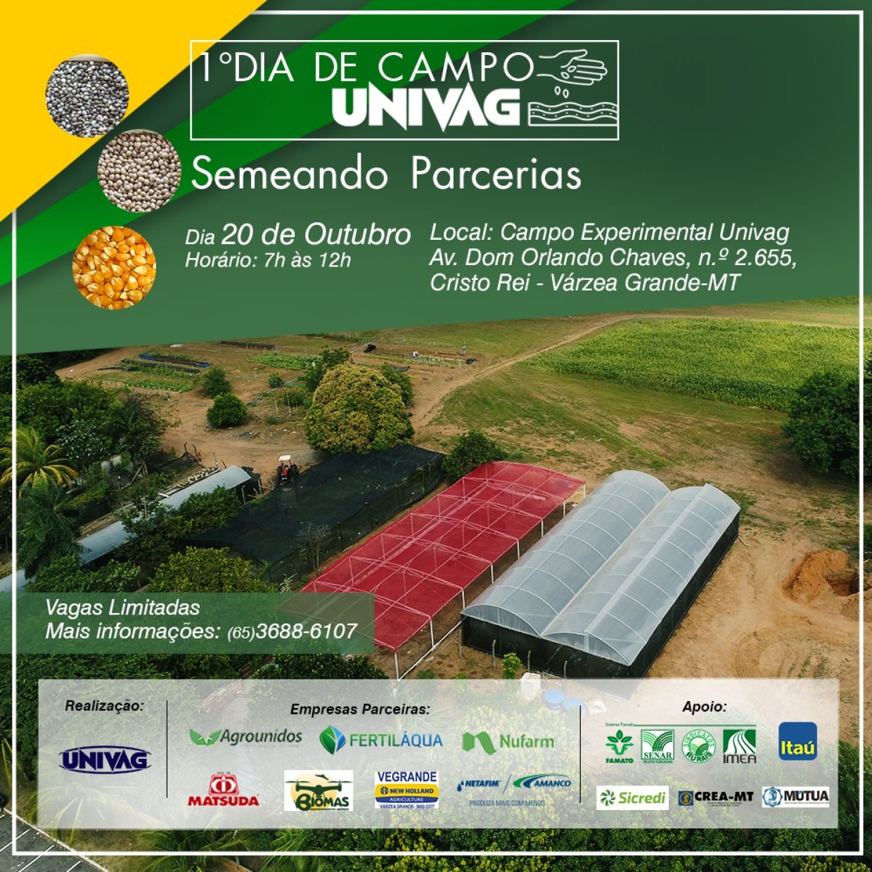 O 1° Dia de Campo Univag – Centro Universitário de Várzea Grande, organizado pelo curso de Agronomia, será realizado neste sábado, 20 de outubro, das 07h às 12h, no Campo Experimental da instituição. O evento é voltado para estudantes de Agronomia e produtores rurais. As inscrições podem ser feitas até o dia 19, pelo endereço eletrônico: https://goo.gl/cq3z6L .