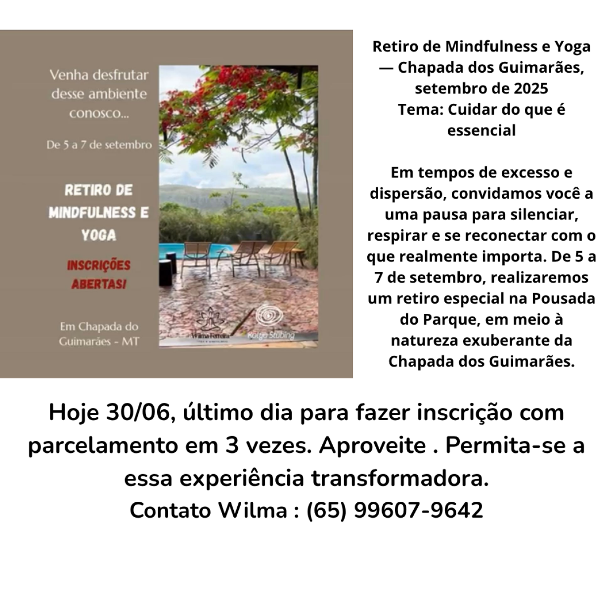 Em tempos de excesso e dispersão, convidamos você para auma pausa para selenciar, respirar e se reconectar com o que realmente importa. De 5 a 7 de setembro, realizaremos, um retiro especial na Pousada do Parque em meio á natureza exeberante de Chapada dos Guimarães. Hoje 30 de junho-último dia para fazer inscrição, com parcelamento em 3 vezes,Aproveite -permita-se a experência transformadora. Contato: Wilma 99607.9642