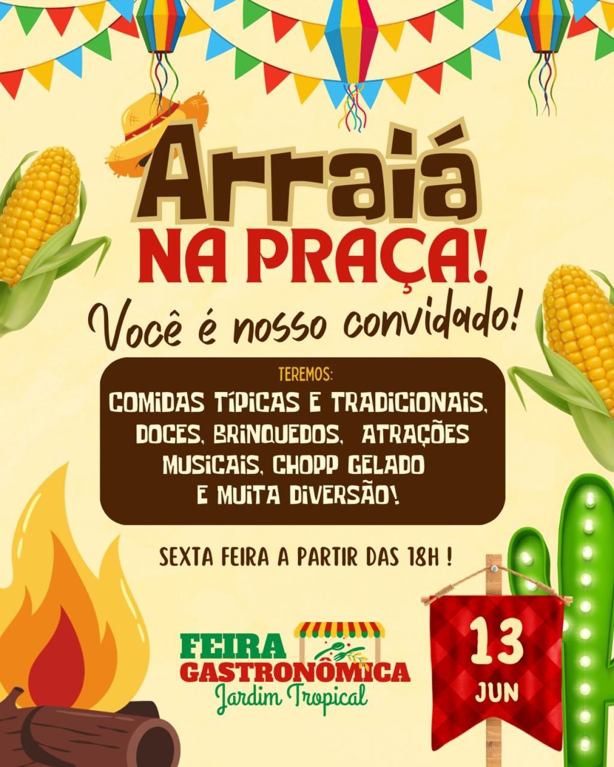 Marque já na sua agenda, dia 13, vai ser feliz no Arraiá da Praça. Muitas barracas deliciosas te esperam com música boa e bebibas a seu gosto.