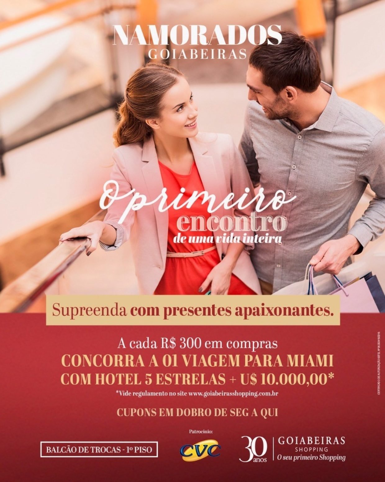 O clima romântico já está no ar no Goiabeiras Shopping. Para destacar a data especial dos namorados, o mall vai sortear, em parceria com a CVC, uma viagem a Miami, com direito a um acompanhante e estadia em hotel 5 estrelas, e U$ 10 mil dólares para gastar com o que quiser.