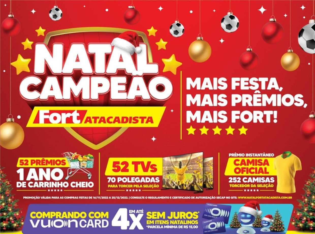 Quem não quer garantir para a sua família um ano inteiro de compras, com direito a carrinho cheio no seu atacadista favorito? Este é apenas um dos vários prêmios que serão sorteados ao longo da campanha de Natal do Fort Atacadista, que é realizada de 16 de novembro até o dia 25 de dezembro nas 52 unidades da rede de atacarejo do Grupo Pereira no país. Além dos 52 prêmios de um ano de carrinho cheio, a campanha Natal Campeão Fort Atacadista também está sorteando 52 televisores de 70 polegadas e ainda 252 camisas da seleção brasileira de futebol. Para participar, é fácil: a cada R$ 100,00 em compras o cliente ganha um número da sorte para concorrer. Clientes das farmácias SempreFort também concorrem ao comprar itens da perfumaria e cosméticos.