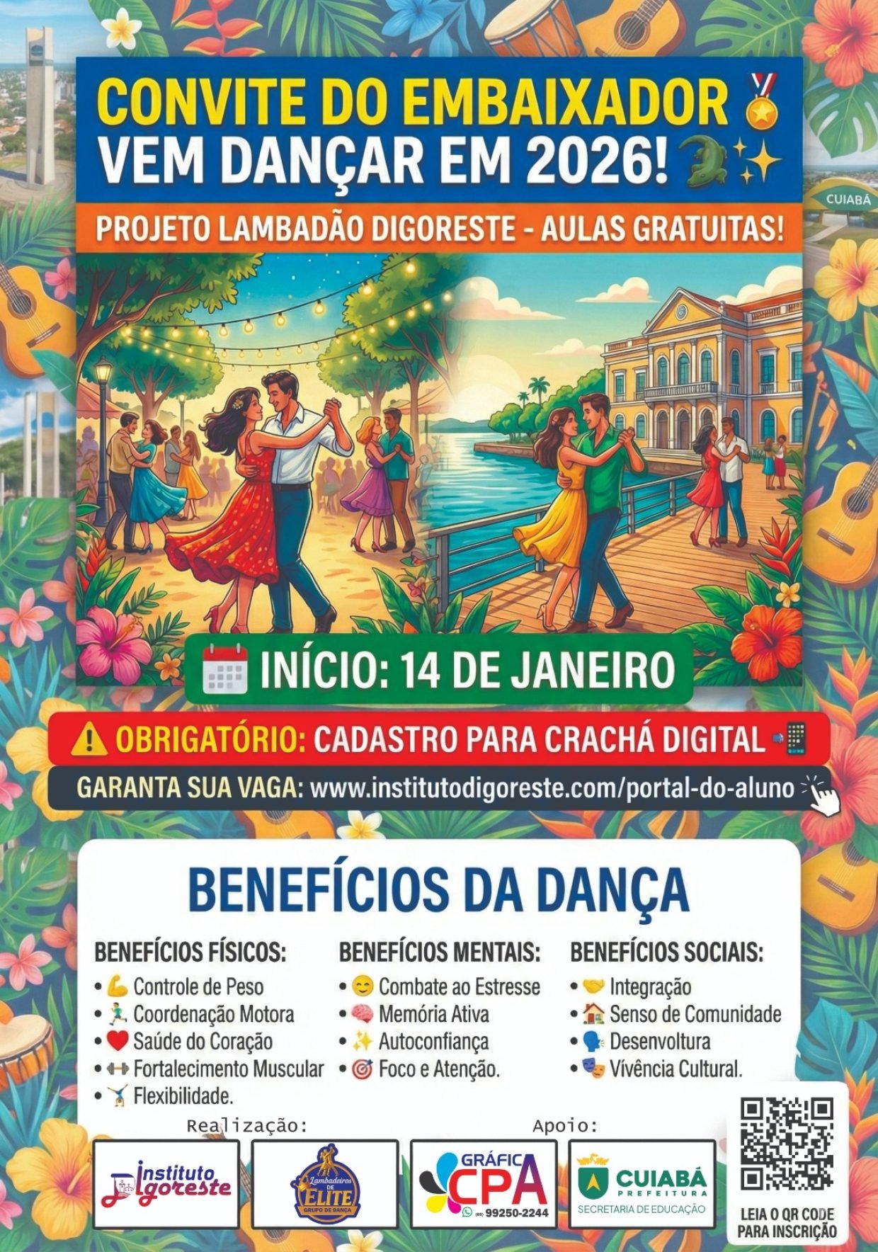 As aulas gratuitas de rasqueado e lambadão realizadas no Complexo Biocultural do Porto vêm se consolidando como uma das principais iniciativas de valorização da cultura popular cuiabana em 2026. As atividades acontecem todas as quintas-feiras, das 19h às 22h, no espaço localizado no Complexo Biocultural do Poto, antigo Mercado do Porto, ao lado do Aquário Municipal, e seguem ao longo de todo o ano, sob a orientação do professor Vladimir Reis. Diante da grande procura e do elevado número de inscritos, a direão do complexo avalia a possibilidade de abertura de uma nova turma.