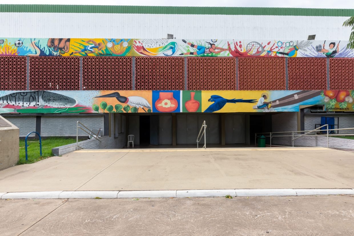A foto mostra a fachada do Ginásio Poliesportivo Dom Aquino, com um mural colorido que retrata elementos da fauna e flora brasileiras. O mural inclui a ilustração de um tuiuiú, vasos cerâmicos e outros elementos culturais.