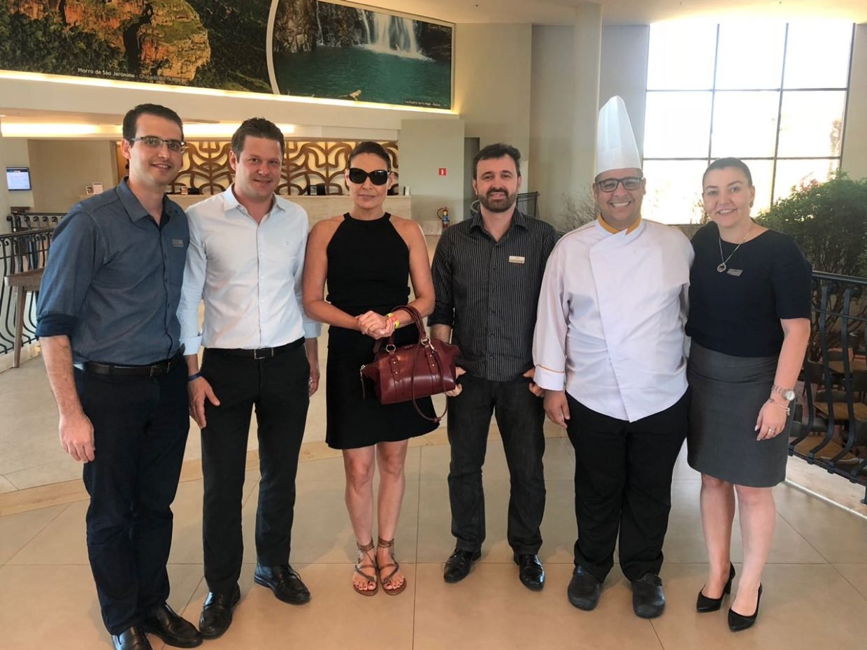 Na foto, Laura posa ao lado da equipe Malai Manso. Da esquerda para direita: Guilherme Donda (Gerente Operacional), Tiago Cabau (Gerente Geral), Eder Pelachim (Gerente de TI), Chef Kaká (Chefe Executivo) e Graziela Ganzer (Gerente de Eventos).