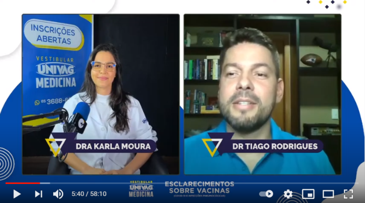 O esclarecimento sobre as vacinas orientado pelo professor do UNIVAG, infectologista Dr. Tiago Rodrigues, com a participação da também professora do UNIVAG e médica pneumologista, Dra. Karla Moura, está disponível na Live de Medicina no canal do YouTube do UNIVAG, no link – https://youtu.be/9c8jYJ-geXo