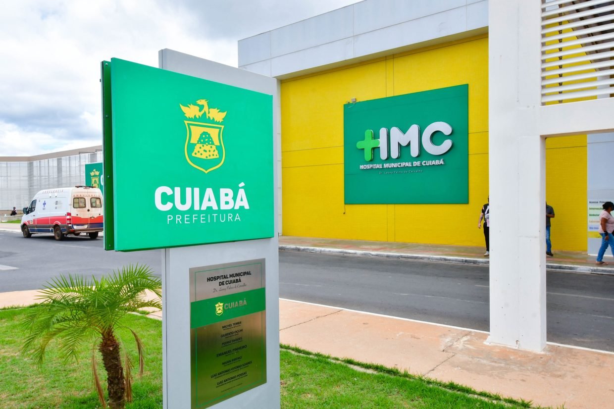 A imagem ilustra a fachada do Hospital Municipal de Cuiabá. A unidade possui as cores verde e amarela.
