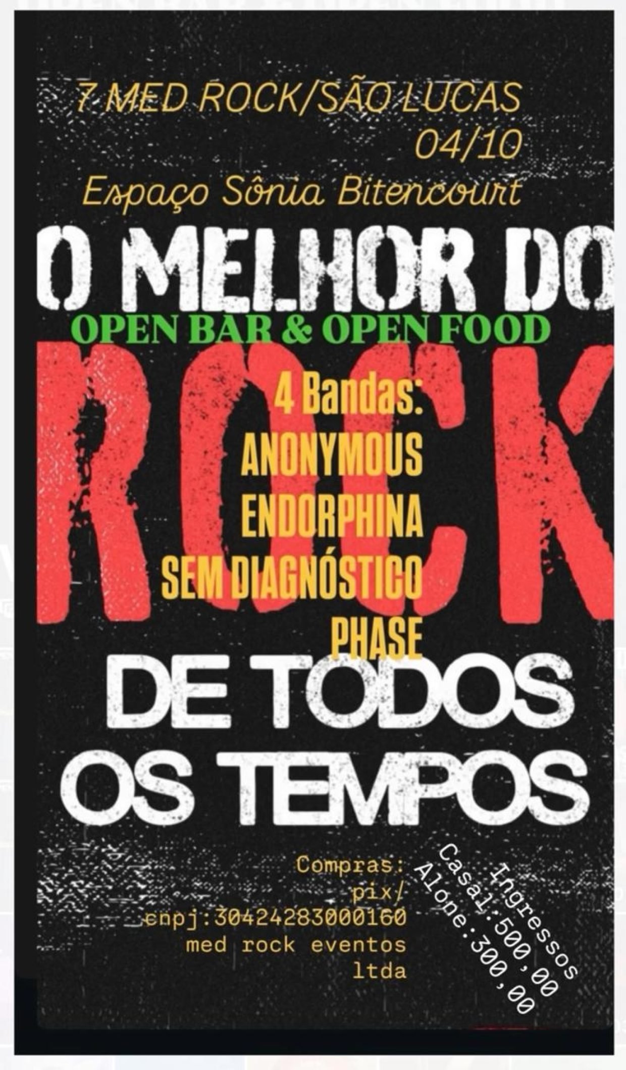 A Festa de São Lucas já tem o seu próximo evento marcado no fim de semana. O 7º Med Rock será, no dia 4 de outubro, no Espaço Sônia Bittencourt, a partir das 20h. O evento se consolidou como um dos encontros mais aguardados na área de saúde. Nesta edição, quatro bandas locais formadas por médicos sobem ao palco: Anonymous, Sem Diagnóstico, Endorphina e Phase.