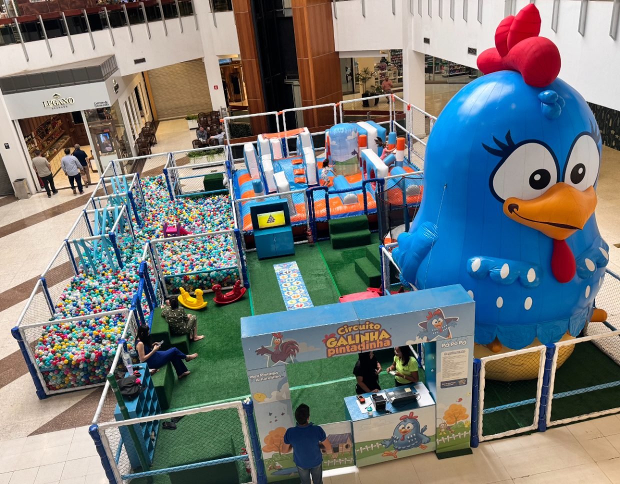 Outra opção é o circuito da Galinha Pintadinha, que conta com módulos infláveis, obstáculos sensoriais, uma mega piscina de bolinhas, games, área de pintura, corredor de elásticos, tapetes interativos, escorregadores e camas elásticas. Esse evento é realizado na Praça Central do shopping, com entrada paga.