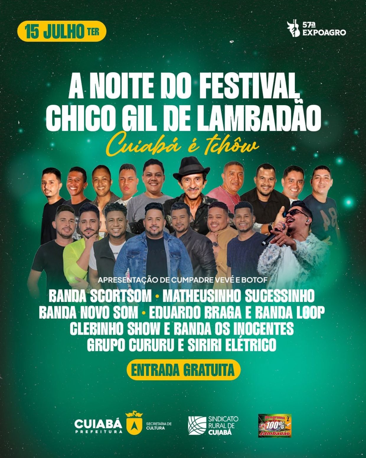 Matheusinho Sucessinho, Scort Som e Banda Novo Som estão entre os artistas que irão movimentar o palco principal da 57ª Expoagro, no dia 15, com entrada gratuita. A programação inclui ainda Clebinho Show e Banda Os Inocentes, para promover uma noite inesquecível no Festival de Lambadão, promovido pela Prefeitura de Cuiabá, por meio da Secretaria Municipal de Cultura. No total, serão oito apresentações ininterruptas, das 21h às 2h da madrugada, num grande resgate de ritmo e cultura.