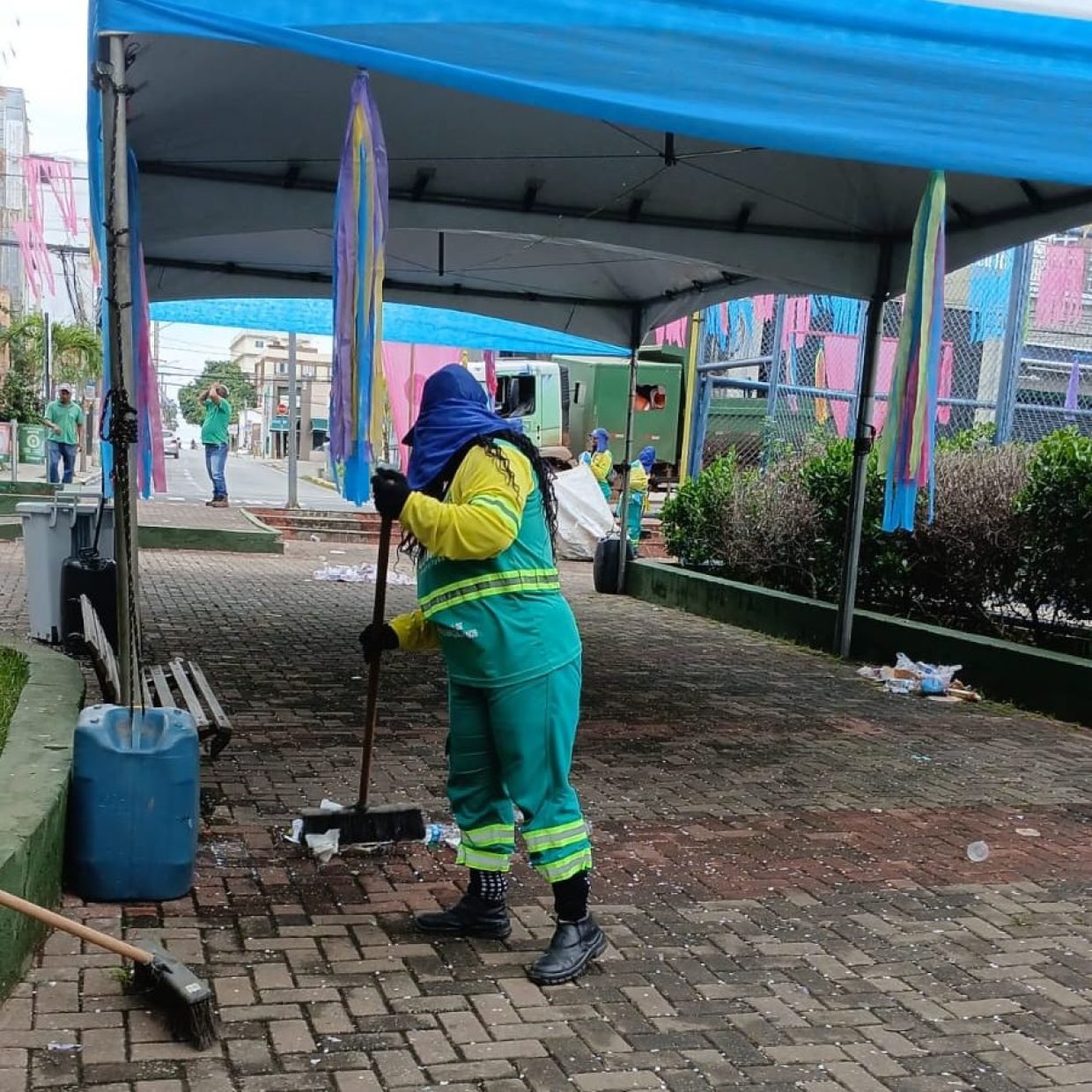 A imagem mostra uma colaboradora da Limpurb realizando a limpeza num ponto da praça Oito de Abril, conhecida popularmente como Praça do Choppão. Ao fundo, há algumas decorações carnavalescas.