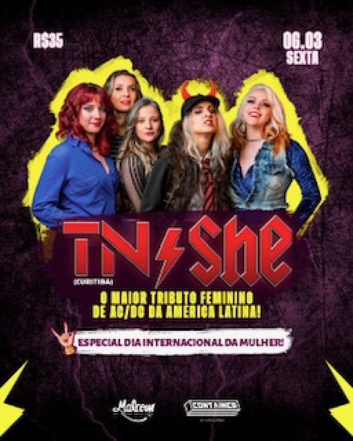 A casa abre às 21h e vai presentear as 50 primeiras mulheres que chegarem com uma lembrança surpresa. A principal atração da noite é a TN/She, considerada o maior tributo feminino ao AC/DC da América Latina. O grupo se apresenta com figurino fiel e presença de palco marcante.