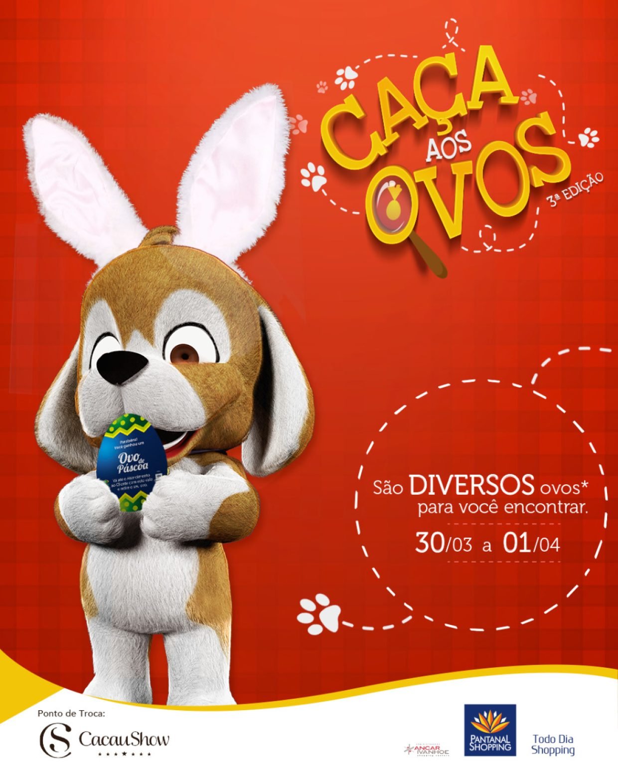 O Pantanal Shopping realiza a “CAÇA AOS OVOS”, entre os dias 30 de março a 01 de abril. A garotada terá que encontrar vales-ovos em pontos estratégicos espalhados pelos corredores do centro comercial. Poderão participar da brincadeira crianças de até 13 anos. Mais informações e todo regulamento, acesse o site www.pantanalshopping.com.br