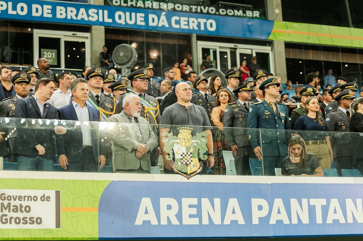 A foto mostra autoridades na arquibancada da Arena Pantanal, prestigiando a formatura.
