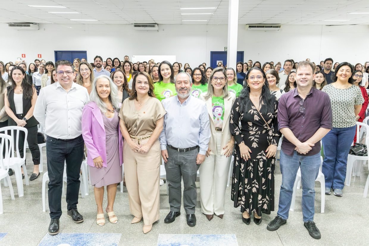 A imagem mostra um grupo de pessoas participando de uma palestra de capacitação dos servidores da Saúde de Cuiabá. À frente, estão as autoridades que compõem a mesa diretora, e ao fundo, os demais servidores que receberam a capacitação.