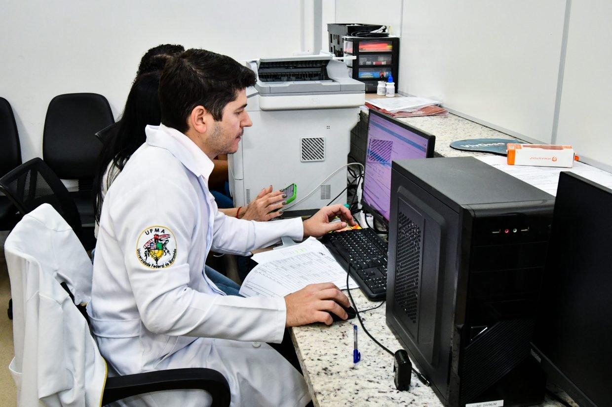 A imagem mostra um médico utilizando um computador numa unidade de saúde. O profissional está vestindo um jaleco branco e sentado em frente ao aparelho.