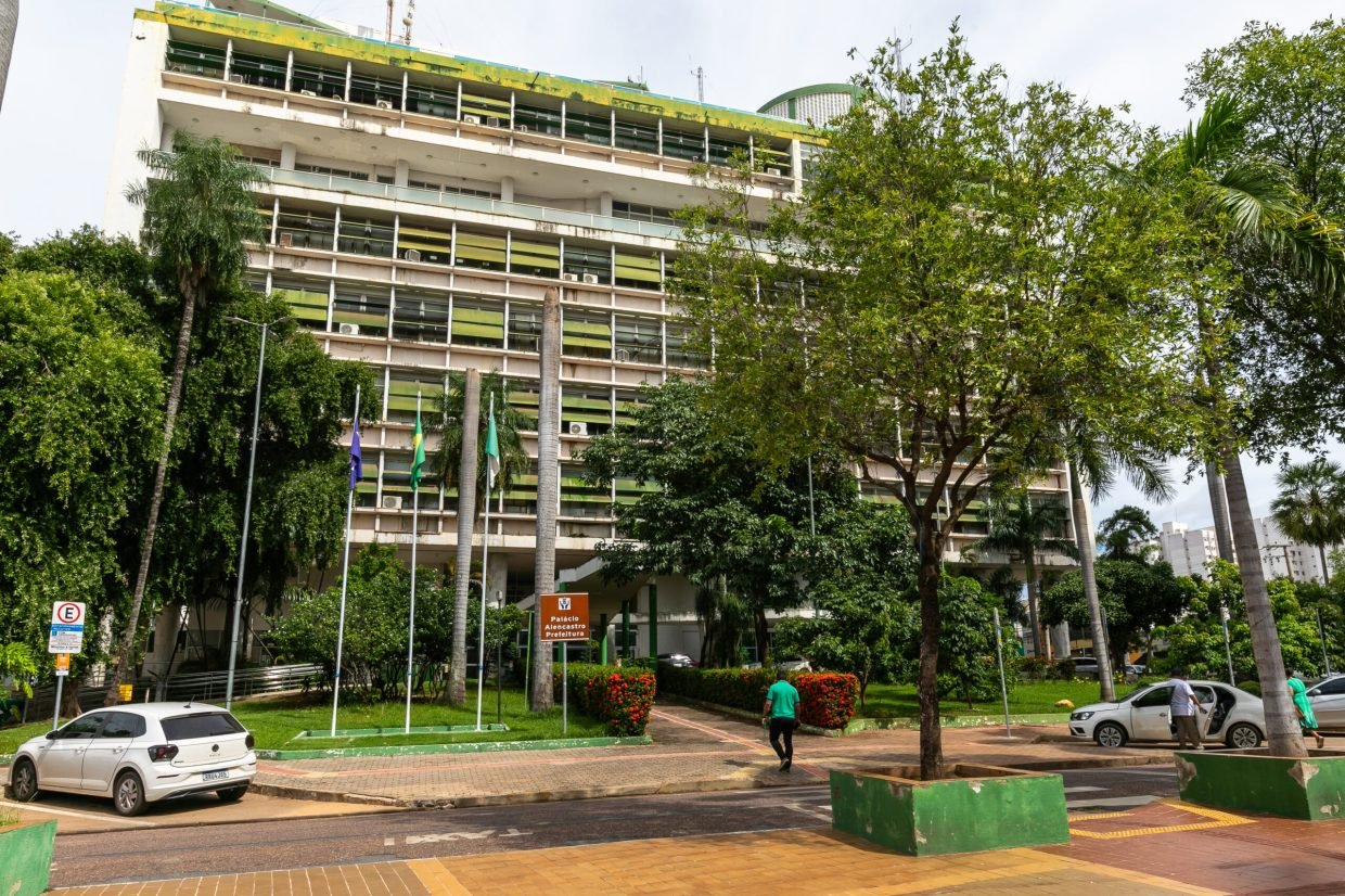 A foto ilustra o prédio do Palácio Alencastro, sede da Prefeitura de Cuiabá, predominantemente nas cores verde e branca. É possível visualizar uma árvore com folhas verdes. Também há dois veículos estacionados em locais adequados.
