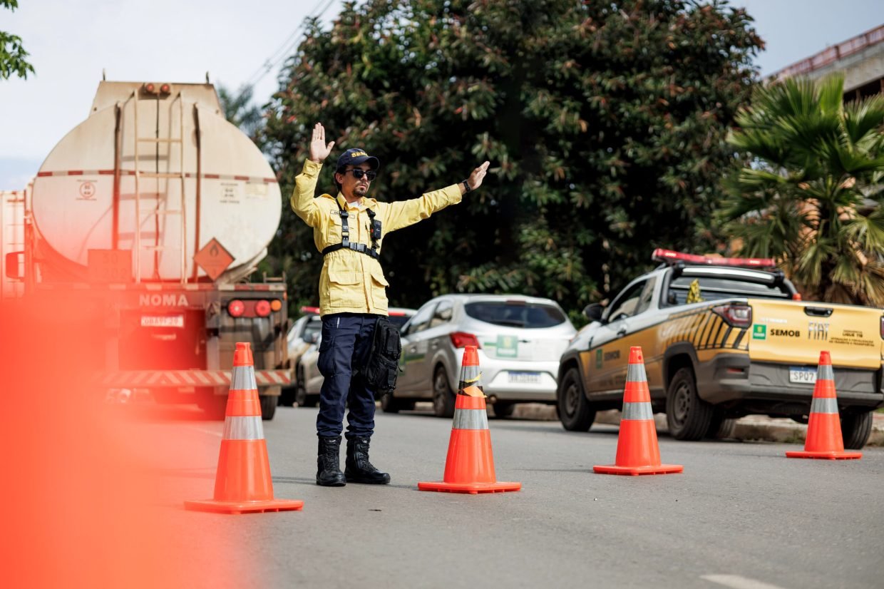 A foto mostra um agente de trânsito com uniforme da Semob, calça azul e camisa amarela. Há cones laranjas na pista enquanto o servidor faz gestos indicando direções.