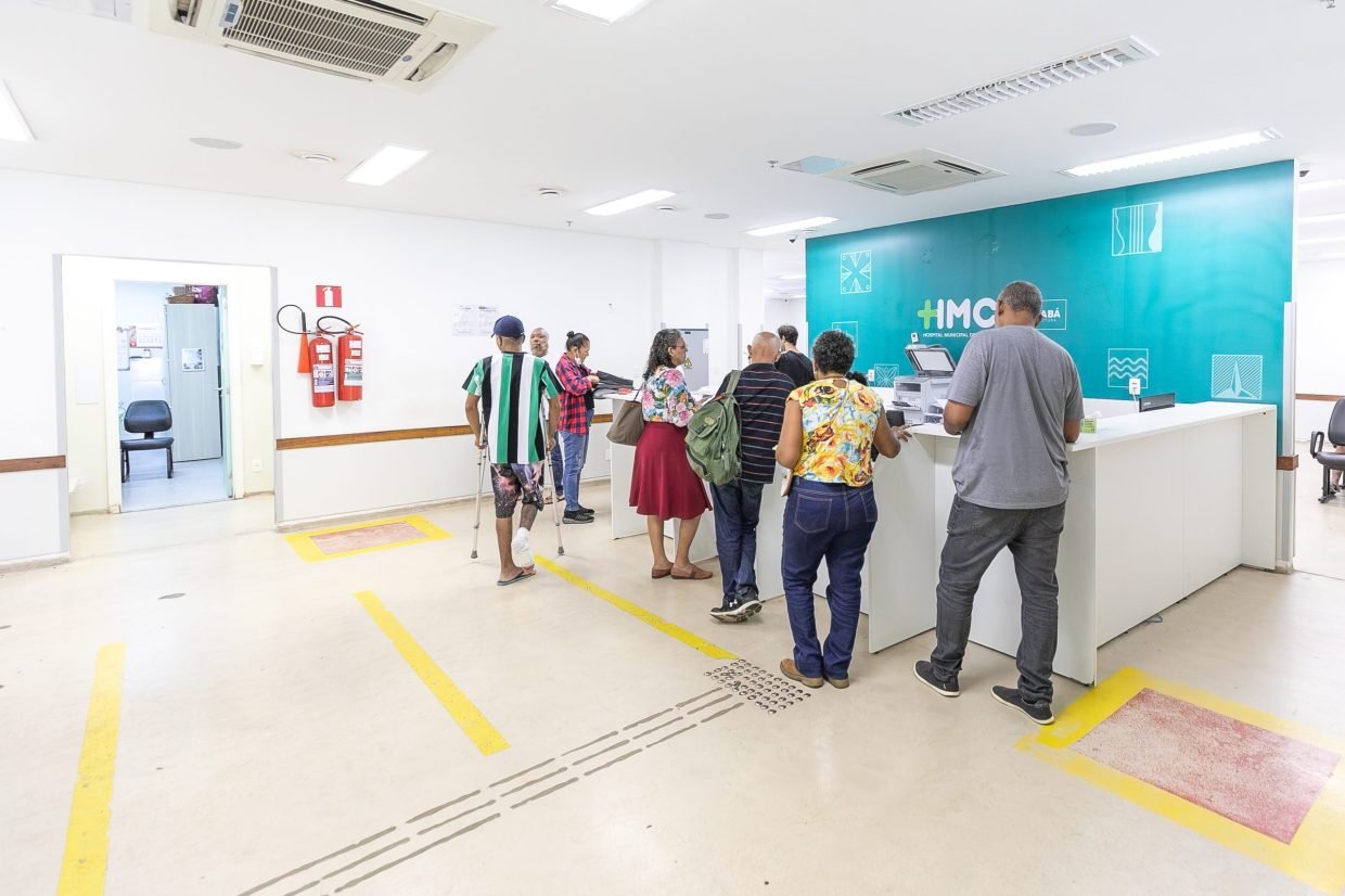 A foto ilustra a recepção do ambulatório do Hospital Municipal de Cuiabá (HMC). No momento, alguns pacientes estão sendo atendidos pelos recepcionistas no balcão de entrada do setor. A imagem apresenta muitas cores, com as paredes brancas ao fundo.