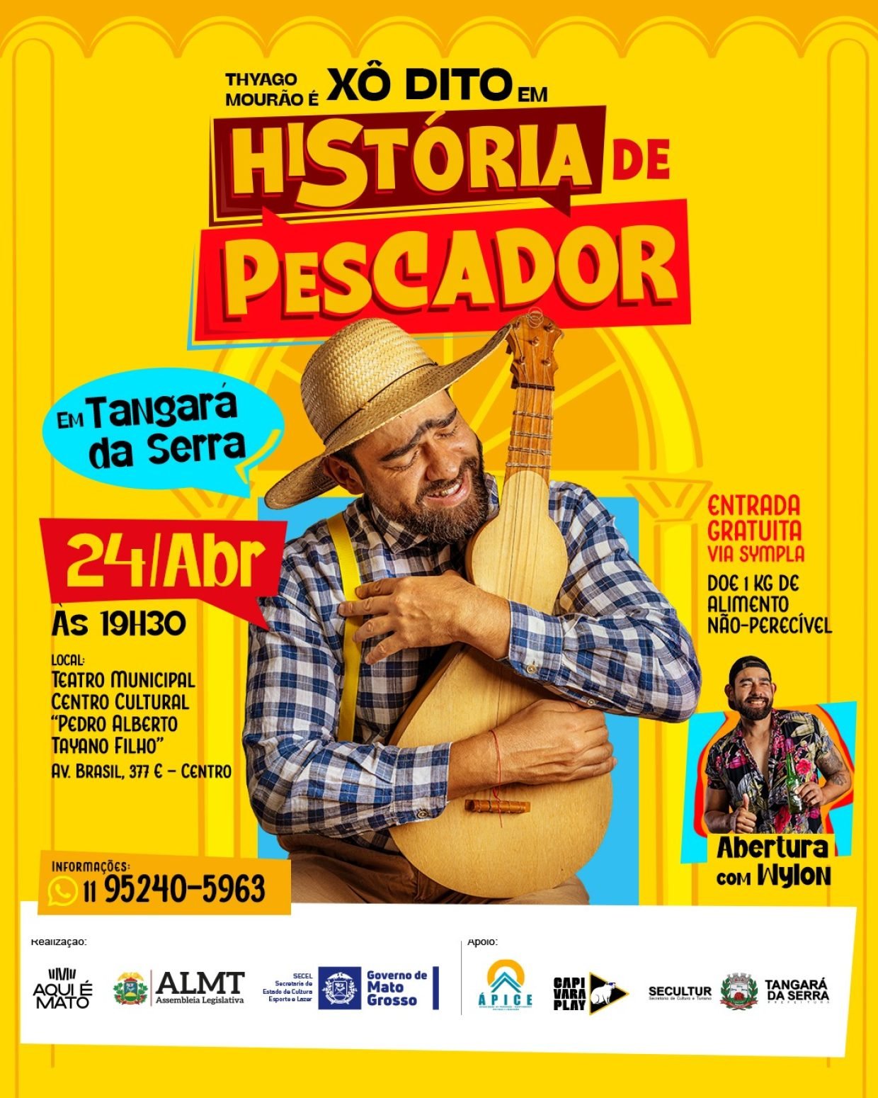 Xô Dito é o personagem icônico do artista Thyago Mourão que comemora 20 anos com a circulação de shows e Oficinas de produção de conteúdo digital gratuita, com o projeto “História de Pescador – Turnê Mato Grosso”. E a população de Tangará da Serra (MT) terá a oportunidade de conferir uma apresentação de humor imperdível, nesta sexta-feira (23.04), no Teatro Municipal-Centro Cultural “Pedro Alberto Tayano Filho”, com a doação de 1kg de alimento não perecível para uma entidade do município. O show abre com o descolado personagem Wylon, sobrinho de Xô Dito, que se destaca pela autoestima inabalável, autoproclamado galã nacional.