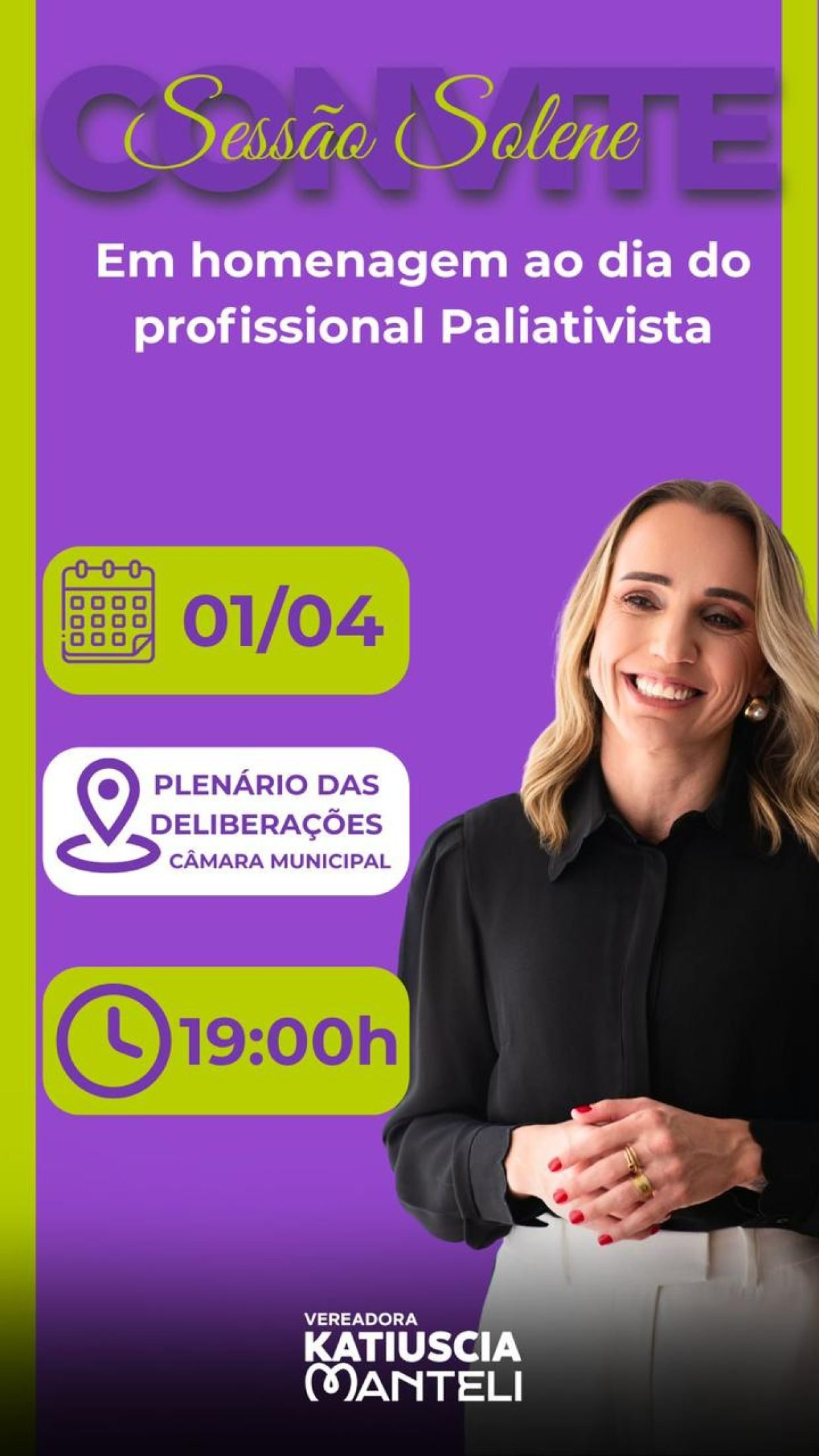 A Câmara Municipal de Cuiabá realiza nesta terça-feira (1), às 19h, uma sessão solene em homenagem ao Dia do Profissional Paliativista. A iniciativa é de autoria da vereadora Katiuscia Manteli (Podemos) e busca reconhecer o trabalho de profissionais que atuam no cuidado de pacientes com doenças graves, promovendo qualidade de vida, conforto e dignidade.