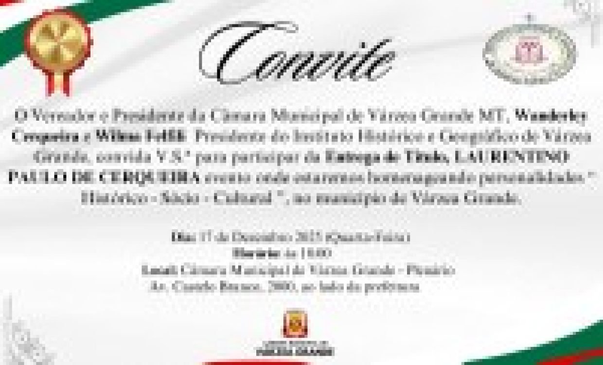 O presidente da Câmara Municipal de Várzea Grande, vereador Wanderley Cerqueira, convida a população para a sessão solene que será realizada hoje (17), às 18h, para a entrega do Título “Laurentino Paulo Cerqueira”, honraria concedida a personalidades que contribuíram de forma significativa para o desenvolvimento histórico, social e cultural do município.