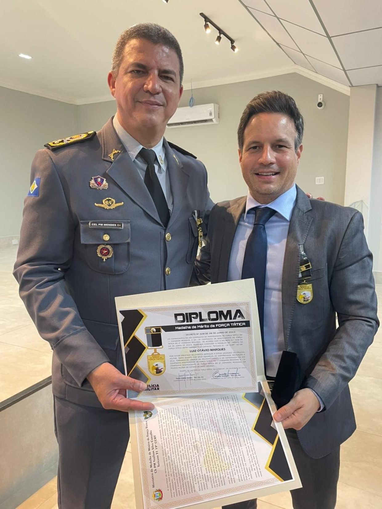 O competente e dinâmico magistrado dr. Luís Otávio Marques recebeu das mãos do Comandante Geral da Polícia Militar de Mato Grosso Cel. Mendes, o Diploma e a Medalha da ‘Força Tática’, pelos relevantes serviços prestados pelo referido magistrado, juiz de direito titular da 3ª Vara Cívil e feitos Gerais da Comarca de Várzea Grande e N. Sra de Livramento-MT onde também desempenha o cargo de Diretor do Fórum. Esta que é a maior e a mais bem estruturada comarca depois da capital Cuiabá. O mérito da conclusão da sede física do novo Fórum, há meses atrás e ainda recebe elogios por parte dos operadores de Direito e pela imensa maioria da sociedade civil organizada! Parabéns brilhante dr. Luís Otávio!