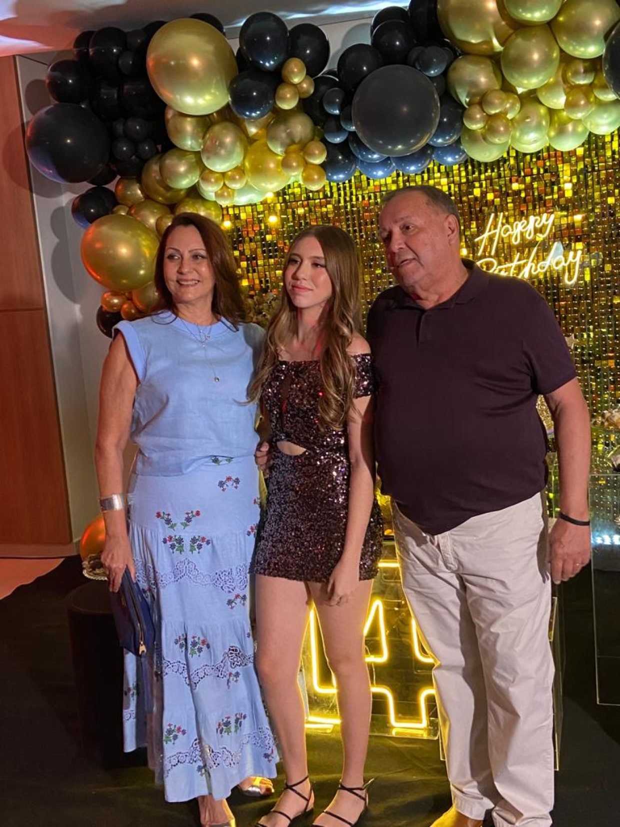 Na melhor fase da vida Maria Julia Moreira da Silva Oliveira toda linda com os avós super presentes Leila e Pedro Moreira na balada de comemoração dos seus 14 aninhos após chegar de uma bela viagem.